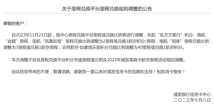 10月8日,浦发信用卡发布其里程兑换规则调整的公告,对各家航司里程兑换比例作出调整(不包含积分充值里程值比例),公告内容将于11月23日正式实施。